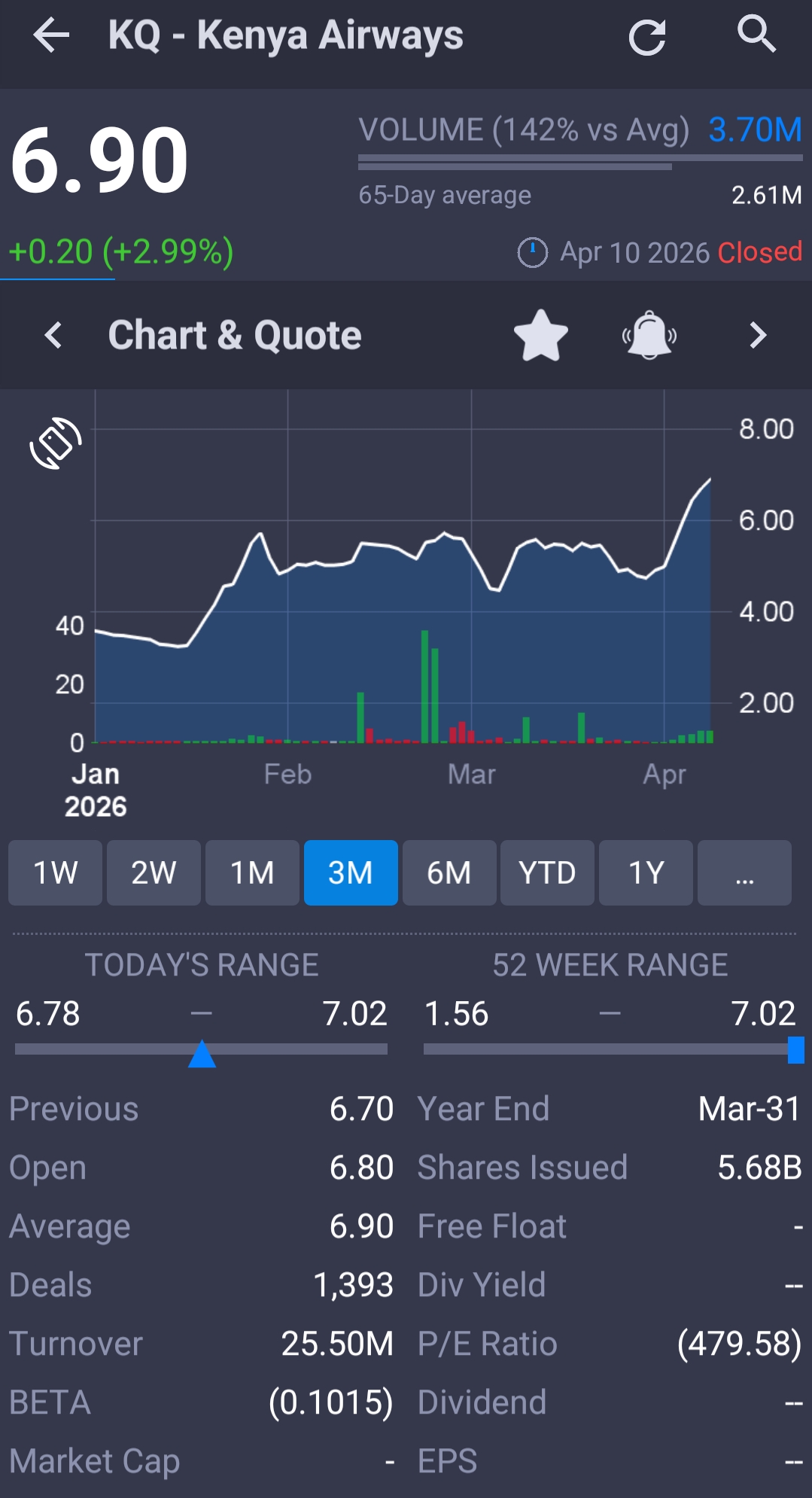 1. KQ. NBV KES (31.16). (Start Price: Ksh 3.30; Current Price KES 6.00. Target/ONO Exit Price range Ksh 8.52 by Dec 31st 2026); About 150% Upside