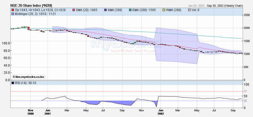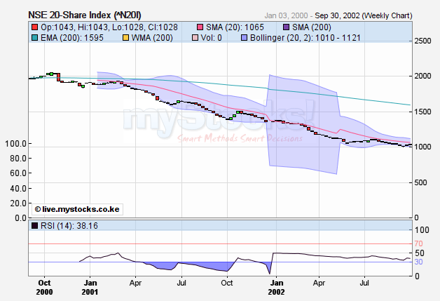 Thanks for the charts. I believe that bear run was part of an 8 year downturn (economy, NSE20 etc) where the market in particular tanked from 5000 in 1994 to 1000 in 2002. Interesting similarities to the current situation. I don't expect the bearish momentum to last eight years this time but I think the bear still has some leg room till sub-2000.