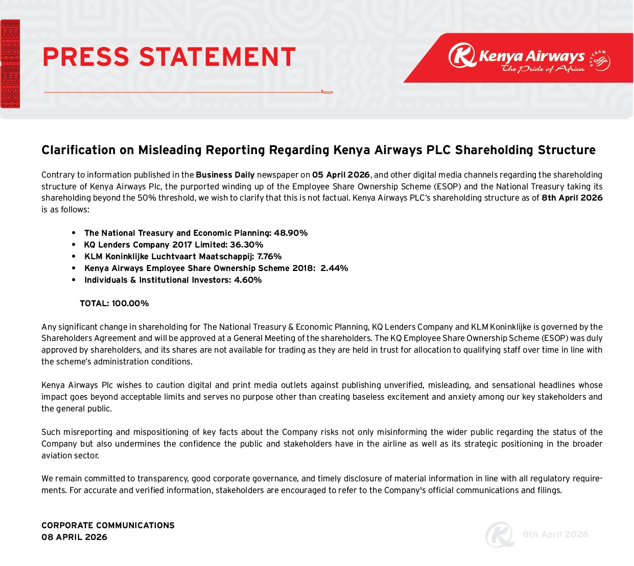 hold real tight and remember, do not invest funds that you may require soon. a third share suspension within 8 years is potentially incoming. remember the last one lasted for 5 long years. this one may not be that adverse. KES 69B fresh capital around the corner. watch and learn Wishing you best of luck as always. This one is too risky for me. Would rather just hold KPLC. All the best too. Risky it is. Risky as hell. Without fresh capital, we are crashing hard, with no survivors @Ali Baba yuko wapi. He would be soo proud of @Obiero. Meanwhile, remember KQ fair value is KES 8.68. Thank me later COOP, IMH, KEGN, KQ, MTNU