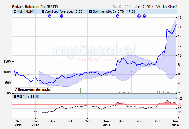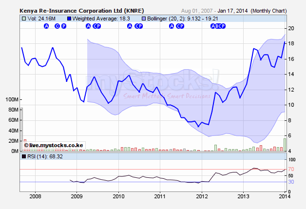 Kenya Re rallied +7.122% to close at 18.80 and this is an All Time High. Kenya Re was trading at 19.00 +8.26% at the Finale. Kenya Re traded 2.589m shares [0.5024% of its shares and hence a material position] worth 48.752m. Kenya Re trades cheap versus its Peers on a P/E Ratio Basis. Kenya Re trades on a Trailing PE of 4.7.My Friend who runs the Dealing Desk on the 6th Floor [I am on the 8th Floor] told me that the Buyers have been relentless and of the well informed variety. Kenya Re is +22.77% in 2014 and thats a pacy, high volume start which is indicating some potentially imminent and high impact News.