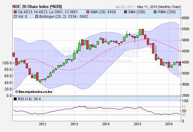 NSE20 is currently in a bollinger bands squeeze since late February. Volatility spike looms. Sizable up or down move very soon. That timing with the global markets on the edge will have sizable power when the moves begin! Went long on Kengen between 5.5-6 still well in the green. Building a cash stockpile from my core business to throw at the bull later in the year. I believe the NSE will trade sideways at least to the end of the year. I concur. Can't see any bull between now and the end of the year. Actually, I think the bear is yet to have its fill. Most of the current prices are yet to reach the levels they were at before the september 2014 bull rush. Capital preservation is paramount. The bottom is not even on the horizon. The main purpose of the stock market is to make fools of as many people as possible.