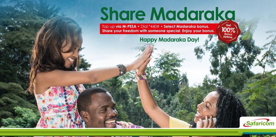 Share Madaraka! Share 100 percent bonus airtime today when you top up via MPESA. Dial *440# to share the bonus airtime. Bonus valid until 8am June 2nd 2015.
